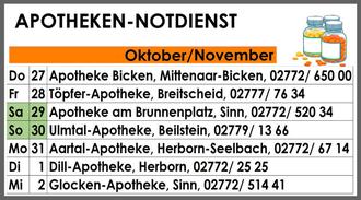 Unsere Gemeinde gehört zum Apotheken-Notdienstkreis 21. Den Notdienst der entsprechenden Apotheken haben wir hier wöchentlich für Sie aufgelistet. Apotheken aus anderen - an unsere Gemeinde angrenzenden - Notdienstkreisen, die möglicherweise aber näher an Ihrem Ortsteil liegen, können Sie sich auf www.apotheke.de anzeigen lassen. Sie haben außerdem die Möglichkeit, sich beim Apothekenfinder unter der Telefonnummer 0800 / 00 22 833 die notdiensthabenden Apotheken in der Nähe ansagen zu lassen.