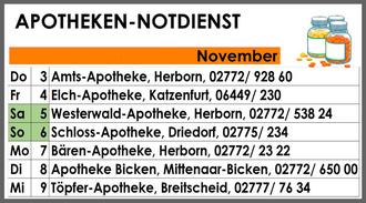 Unsere Gemeinde gehört zum Apotheken-Notdienstkreis 21. Den Notdienst der entsprechenden Apotheken haben wir hier wöchentlich für Sie aufgelistet. Apotheken aus anderen - an unsere Gemeinde angrenzenden - Notdienstkreisen, die möglicherweise aber näher an Ihrem Ortsteil liegen, können Sie sich auf www.apotheke.de anzeigen lassen. Sie haben außerdem die Möglichkeit, sich beim Apothekenfinder unter der Telefonnummer 0800 / 00 22 833 die notdiensthabenden Apotheken in der Nähe ansagen zu lassen.
