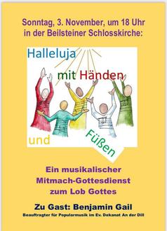 Am Sonntag, dem 3. November, feiern wir unseren Gottesdienst erst abends um 18.00 Uhr in der evangelischen Schlosskirche in Beilstein. Wir feiern ihn als musikalischen Lobpreis- und Mitmach-Gottesdienst, der musikalisch - außer von unserer Organistin Martha Schmidt - in erster Linie von unserem Dekanats-Popularmusik-Beauftragten Benjamin Gail aus Lich gestaltet wird.