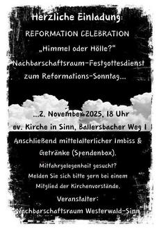| 18:00 Uhr | Gemeinsamer Nachbarschaftsraum-Gottesdienst unter dem Motto „Reformation Celebration“ in der ev. Kirche in Sinn (mit allen Mitgliedern des Verkündigungsteams und anschließendem mittelalterlichen Imbiss) |