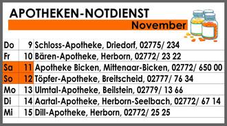 Unsere Gemeinde gehört zum Apotheken-Notdienstkreis 21. Den Notdienst der entsprechenden Apotheken haben wir hierwöchentlich für Sie aufgelistet. Apotheken aus anderen - an unsere Gemeinde angrenzenden - Notdienstkreisen, die möglicherweise aber näher an Ihrem Ortsteil liegen, können Sie sich auf www.apotheken.de anzeigen lassen.