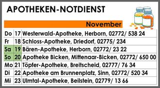 Unsere Gemeinde gehört zum Apotheken-Notdienstkreis 21. Den Notdienst der entsprechenden Apotheken haben wir hier wöchentlich für Sie aufgelistet. Apotheken aus anderen - an unsere Gemeinde angrenzenden - Notdienstkreisen, die möglicherweise aber näher an Ihrem Ortsteil liegen, können Sie sich auf www.apotheke.de anzeigen lassen. Sie haben außerdem die Möglichkeit, sich beim Apothekenfinder unter der Telefonnummer 0800 / 00 22 833 die notdiensthabenden Apotheken in der Nähe ansagen zu lassen.