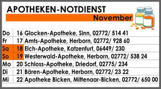 Unsere Gemeinde gehört zum Apotheken-Notdienstkreis 21. Den Notdienst der entsprechenden Apotheken haben wir hierwöchentlich für Sie aufgelistet. Apotheken aus anderen - an unsere Gemeinde angrenzenden - Notdienstkreisen, die möglicherweise aber näher an Ihrem Ortsteil liegen, können Sie sich auf www.apotheken.de anzeigen lassen.