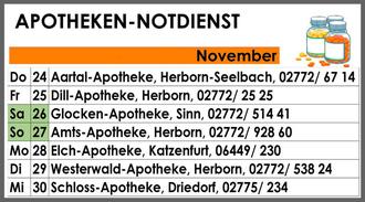 Unsere Gemeinde gehört zum Apotheken-Notdienstkreis 21. Den Notdienst der entsprechenden Apotheken haben wir hier wöchentlich für Sie aufgelistet. Apotheken aus anderen - an unsere Gemeinde angrenzenden - Notdienstkreisen, die möglicherweise aber näher an Ihrem Ortsteil liegen, können Sie sich auf www.apotheke.de anzeigen lassen. Sie haben außerdem die Möglichkeit, sich beim Apothekenfinder unter der Telefonnummer 0800 / 00 22 833 die notdiensthabenden Apotheken in der Nähe ansagen zu lassen.