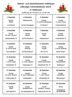 Die Idee des Heimat- und Geschichtsvereines Holzhausen, in diesem Jahr einen lebendigen Adventskalender an Holzhäuser Häuserfassaden in der Zeit vom 1. bis 24. Dezember zu präsentieren, fand im Ort viel Zuspruch, wofür wir uns herzlich bedanken.