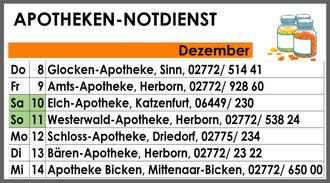 Unsere Gemeinde gehört zum Apotheken-Notdienstkreis 21. Den Notdienst der entsprechenden Apotheken haben wir hier wöchentlich für Sie aufgelistet. Apotheken aus anderen - an unsere Gemeinde angrenzenden - Notdienstkreisen, die möglicherweise aber näher an Ihrem Ortsteil liegen, können Sie sich auf www.apotheke.de anzeigen lassen. Sie haben außerdem die Möglichkeit, sich beim Apothekenfinder unter der Telefonnummer 0800 / 00 22 833 die notdiensthabenden Apotheken in der Nähe ansagen zu lassen.