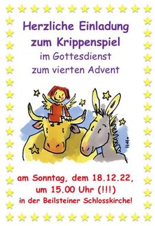 Am Sonntag, dem 18. Dezember (also am vierten Advent), wird in der Beilsteiner Schlosskirche das diesjährige Krippenspiel aufgeführt, und zwar nicht - wie im Dezember-Gemeindebrief angekündigt - um 16 Uhr, sondern bereits um 15 Uhr! Bitte beachten!