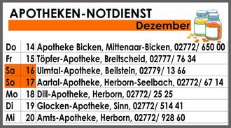 Unsere Gemeinde gehört zum Apotheken-Notdienstkreis 21. Den Notdienst der entsprechenden Apotheken haben wir hierwöchentlich für Sie aufgelistet. Apotheken aus anderen - an unsere Gemeinde angrenzenden - Notdienstkreisen, die möglicherweise aber näher an Ihrem Ortsteil liegen, können Sie sich auf www.apotheken.de anzeigen lassen.