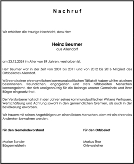 Herr Beumer war in der Zeit von 2001 bis 2011 und von 2012 bis 2016 Mitglied des Ortsbeirates Allendorf.