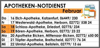 Unsere Gemeinde gehört zum Apotheken-Notdienstkreis 21. Den Notdienst der entsprechenden Apotheken haben wir hierwöchentlich für Sie aufgelistet. Apotheken aus anderen – an unsere Gemeinde angrenzenden – Notdienstkreisen, die möglicherweise aber näher an Ihrem Ortsteil liegen, können Sie sich auf www.apotheken.de anzeigen lassen.