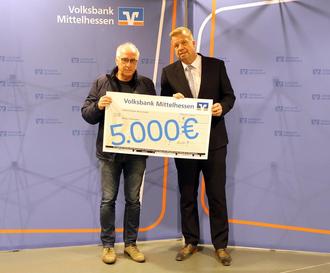 Klaus Herrmann im Beisein von Lars Wittek einem der beiden Vorstandssprecher der VOBA Mittelhessen freut sich über 5.000 Euro von der Volksbank Mittelhessen.