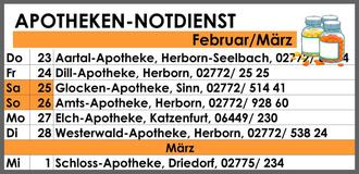 Unsere Gemeinde gehört zum Apotheken-Notdienstkreis 21. Den Notdienst der entsprechenden Apotheken haben wir hierwöchentlich für Sie aufgelistet. Apotheken aus anderen – an unsere Gemeinde angrenzenden – Notdienstkreisen, die möglicherweise aber näher an Ihrem Ortsteil liegen, können Sie sich auf www.apotheken.de anzeigen lassen.