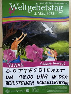 Am Freitag, dem 3. März, findet um 18 Uhr in der evangelischen Schlosskirche in Beilstein der Gottesdienst zum diesjährigen Weltgebetstag statt, den die Ev. Kirchengemeinden Beilstein-Rodenroth und Ulmtal wie üblich gemeinsam feiern. Die Liturgie ist in diesem Jahr von Frauen aus Taiwan unter dem Thema „Glaube bewegt“ vorbereitet worden. Alle interessierten Frauen und Männer, egal welcher Konfession, sind dazu herzlich eingeladen.
