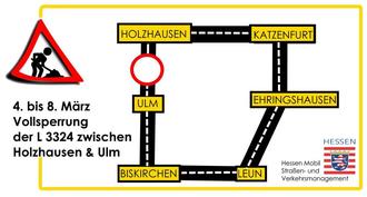 Hessen Mobil beabsichtigt den festgestellten Verkehrsnotstand im Zuge der L 3324 zwischen Greifenstein-Ulm und Greifenstein-Holzhausen in Kürze zu beseitigen. Um die Arbeiten ausführen zu können, ist eine Vollsperrung der L 3324 vom 04.03.2024 bis voraussichtlich 08.03.2024 notwendig. Die Umleitung des Verkehrs erfolgt über die Orte Katzenfurt, Ehringshausen, Leun, Biskirchen und ist als U10/U11 ausgeschildert.
