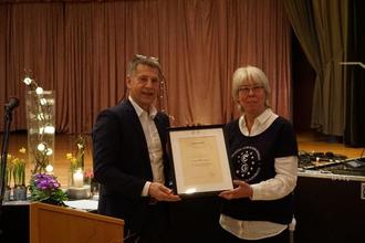 Herr Stiftungsvorsitzender Peter Kremer überreicht der Vorsitzenden des Fördervereins, Frau Edith Müller-Zimmermann die Urkunde für den Dr. Leinweber-Preis 2023