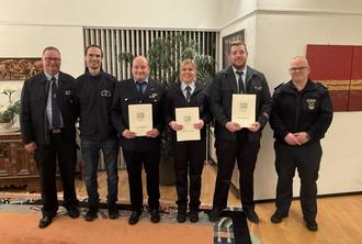 von links nach rechts: Jürgen Weisbrod Abt. Rüchenbach; Florian Debus Abt. Rachelhausen; Fridtjof Müller Abt. Rachelshausen; Diana Hof-Schneider Abt. Rüchenbach; Jonas Weisbrod Abteilung Rüchenbach; Alexander Scheiwe in Funktion des 1. Stellv. Stadtbrandinspektors ⇔ (Bildquelle: Peter Kremer)