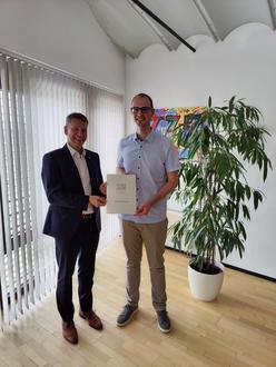 Das Foto zeigt Herrn Bürgermeister Peter Kremer bei der Übergabe der Ernennungsurkunde an Herrn Julian Inderthal.