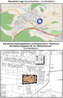 Die räumliche Lage und der Entwurf der Bebauungsplanänderung gehen aus den nachstehenden Übersichtskarten hervor (gestrichelt umrandeter Bereich).