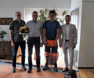 von links: Fachdienstleiter Bauhof Volker Glanz, Reinhard Hornbruch, Personalratsvorsitzender Timo Bernhardt, Bürgermeister Peter Kremer