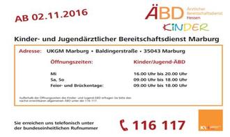 Notfälle in der Zeit zwischen 24:00 Uhr und 08:00 Uhr werden durch die Dienstärzte im Notfallbereich des Klinikums Marburg übernommen.