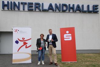 Christina Anna Bögel vom Sportkreis und Daniel Marburger von der Sparkasse Marburg-Biedenkopf freuen sich auf den Sporttag am 28. September in der Hinterlandhalle.