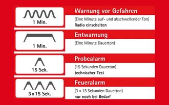 Die Warnung der Bevölkerung erfolgt durch einen einminütigen auf- und abschwellenden Heulton. Die Entwarnung wird durch einen einminütigen Dauerton signalisiert. Die Alarmierung der Feuerwehr bleibt wie bisher ein einminütiger Dauerton, der zweimal unterbrochen wird.