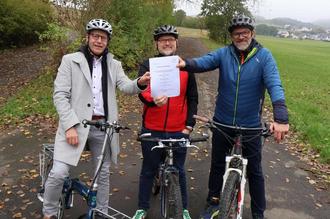 Gemeinsam für den Radverkehr: Gladenbachs Bürgermeister Peter Kremer, Landrat Jens Womelsdorf und Dautphetals Bürgermeister Marco Schmidtke (v.l.) präsentieren die Verwaltungsvereinbarung zur gemeinsamen Zusammenarbeit bei der Erstellung einer Machbarkeitsuntersuchung. Damit soll geprüft werden, ob und in welcher Form eine Radwegverbindung möglich ist, die den Gladenbacher Stadtteil Runzhausen mit dem Dautphetaler Ortsteil Amelose direkt für den Radverkehr verbindet. (Foto: Landkreis Marburg-Biedenkopf)