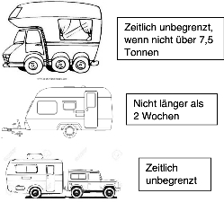 Wohnmobile dürfen grundsätzlich unbegrenzt lange auf öffentlichen Straßen und Parkplätzen abgestellt werden, solange sie zugelassen sind. Aufpassen muss man nur mit einem Wohnmobil, dass mehr als 7,5 Tonnen wiegt. Denn die StVO sieht eine Einschränkung beim Parken vor: Kraftfahrzeuge mit einem zulässigen Gesamtgewicht über 7,5 Tonnen dürfen innerhalb geschlossener Ortschaften in Wohngebieten und Erholungsgebieten in der Zeit von 22:00 Uhr bis 06:00 Uhr sowie an Sonn- und Feiertagen nicht geparkt werden.