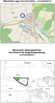 Die räumliche Lage und der Entwurf der Ergänzungssatzung (Planteil) gehen aus den nachstehenden Übersichtskarten hervor (gestrichelt umrandeter Bereich).