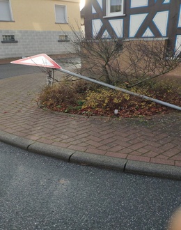 Zum wiederholten Male wurde das Straßenschild/Verkehrsschild Herborner Straße / Turmstraße im Stadtteil Erdhausen mutwillig umgeknickt. “ (s. Foto).