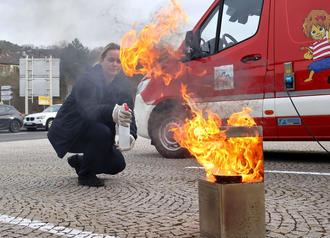Auf der MEMOlife zeigen Katrin Lang und ihre Kolleginnen und Kollegen von der Gefahrenabwehr des Kreises unter anderem, warum ein Fettbrand nie mit Wasser gelöscht werden sollte. (Foto: Landkreis Marburg-Biedenkopf/Maximilian Schlick)
