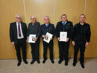 von links: Erster Stadtrat Armin Becker, Werner Lauer (Goldene Ehrenplakette), Frank Naumann-Prinz (Goldene Ehrenplakette), Jens Meier (Beförderung zum Löschmeister), Carsten Müller (stellv. SBI).