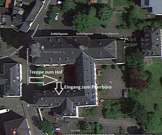Wie unten dargestellt erfolgt der Zugang über den Hof rechts neben der Pfarrkirche und dann durch den Eingang in der Mitte des Gebäudes gegenüber der Kirche.