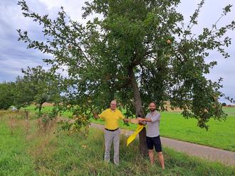 Bürgermeister Michael Ruoff zusammen mit dem SPD-Fraktionsvorsitzenden Marius Lorkowski an einem der markierten Obstbäume zwischen Faulbach und Niederweyer.