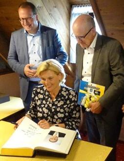 Foto: Bürgermeister Michael Ruoff und Landtagsabgeordneter Christian Wendel gemeinsam mit Julia Klöckner vor ihrer Signierung im goldenen Buch der Stadt Hadamar.