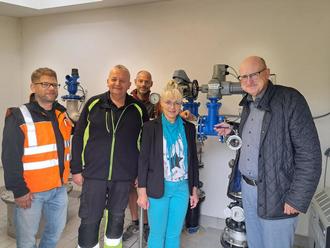 Bauleiter der Firma Reuscher Steffen Willig, Wassermeister Jochen Esser, Artec-Projektleiter Dominik Kaiser, Bauamtsleiterin Brit Kuhl-Wengenroth sowie Bürgermeister Michael Ruoff, bei der symbolischen Anschaltung der neuen Wasserleitung.