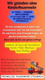 Wir laden alle interessierten Eltern mit ihren Kindern zu unserem Infoabend am 22.04.2024 um 17 Uhr im Gerätehaus der Freiwilligen Feuerwehr Steinbach ein.
