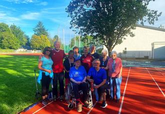 Anfang September war es dann soweit. Es galt die Prüfungen fürs Sportabzeichen zu bestehen. Nach einem kurzen Aufwärmprogramm schaffte Stamm in der Kategorie Schnelligkeit das 50 m Rollstuhlfahren in der erforderlichen Zeit.