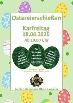 Am Karfreitag den 18.04.2024, lädt der Schützenverein Oberzeuzheim von 10 Uhr bis 16 Uhr zum traditionellen Ostereierschießen und Heringsessen ins Schützenhaus ein.