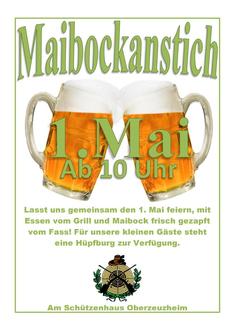Der Schützenverein Oberzeuzheim lädt ein zum Grillfest mit Maibockanstich am Donnerstag, 1. Mai ab 10 Uhr am Schützenhaus in Oberzeuzheim. Bei Grillspezialitäten, Pommes frites und frisch gezapftem Bier können die Besucher den Tag entspannt ausklingen lassen. Für die Kinder steht eine Hüpfburg bereit.