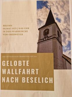 findet in diesem Jahr wieder die Gelobte Wallfahrt von Oberweyer nach Beselich statt. Die Wallfahrt beginnt um 09:00 Uhr in der Pfarrkirche von Oberweyer. Danach startet die gemeinsame Prozession zur Kapelle nach Beselich. Der Gottesdienst in der Kapelle von Beselich beginnt um 10:45 Uhr. Nach dem Gottesdienst bietet der Ortsauschuss Oberweyer allen Kirchenbesuchern einen Imbiss in Form von Bratwurst mit Brötchen und Getränke an.