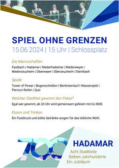 Am Samstagvormittag kann der neue „Jubiläumsweg 700“ schon mal mit Unterstützung des Lauftreffs Hadamar gelaufen oder gegangen werden. Er führt durch alle Hadamarer Stadtteile und wird von einem Pendelbus begleitet. Am Nachmittag treten dann Teams aus allen Ortsteilen gegeneinander mit Spaß und Gaudi an. Vom Bierkistenstapeln über Hindernis-Parcours und knifflige Fragen ist für alle etwas dabei.