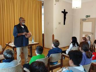Lesen ist eine Grundlage des Bildungserfolgs. Und so hatte die katholisch Öffentliche Bücherei Hadamar- ökumenisch geführt- zum bundesweiten Vorlesetag auch in diesem Jahr wieder die drei vierten Klassen der Grundschule eingeladen. An diesem Vormittag konnte man eine Stecknadel fallen hören, als Jean-Félix Belinga Belinga, mit leiser Stimme vom größten Kontinent Afrika und seinem Heimatland Kamerun erzählte. Begleitet auf der Gitarre, sang der 69 jährige Autor mit den Kindern ein Begrüßungslied in seiner Muttersprache Bulu. Und schon waren die begeisterten Kinder in der Welt des jungen Akib, in seinem Dorf am Fluss, angekommen. Hier leuchteten die gelben Felder mit Mais, der die Dorfbewohner ernährte. Gebannt hörten die Viertklässler von jenem heißen Sommer, als der Regen ausblieb und kein Mais wachsen konnte.. „Sollen wir das Dorf verlassen und unser Glück woanders suchen?“, überlegten die hungrigen Bewohner. des Dorfes in Kamerun. Nein, Akibas beständiges Trommelspiel konnte den Regen nicht herbeizaubern. Auch eigneten sich die Lösungsideen der Zuhörer zur Bewässerung der Felder nicht. Die hartnäckige Trockenheit, das größte Problem Afrikas, wurde durch diese märchenhafte Erzählung vermittelt. Jedoch hörten die vierten Klassen der Herzenbergschule Hadamar während dieser Autorenlesung auch von Hoffnung, den Mut, um durchzuhalten und einer Lösung, wie sie tatsächlich nur im Märchen zu finden ist. Jean-Félix Belinga Belinga rundete mit einem gemeinsamen Abschiedslied in Bulu diesen besonderen bundesweiten Vorlesetag ab.