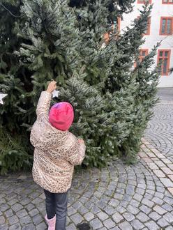 Hadamar. Am Mittwoch, den 4. Dezember schmückten zehn Kinder der Kindertagesstätte Villa Zauberhaft, eine Einrichtung des Lahn-Kinderkrippen e. V., den großen Weihnachtsbaum am Schlossplatz. Die Stadt hatte die Kita-Kinder eingeladen, Baumschmuck zu basteln und im Anschluss selbst anzubringen. Drei Tage lang gestalteten die Kleinen mit großem Eifer Lebkuchenmänner, Kerzen und Sterne, die sie zunächst vorzeichneten, dann ausschnitten, bemalten und laminierten. Am Mittwoch machten sich dann zehn Kinder gemeinsam mit ihren Erzieherinnen auf den Weg zum Schlossplatz, um den gebastelten Weihnachtsschmuck in Szene zu setzen. Die Dekoration der weiteren Bäume übernahmen der Kinderschutzbund und die Kindertagesstätte Marienfried.