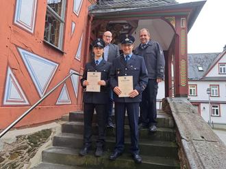 v.l.n.r. Die zwei neuen Ehrenbeamten der Stadt Hadamar Christoph May und Stefan Frankenbach gemeinsam mit Bürgermeister Michael Ruoff und Stadtbrandinspektor Jürgen Horn.