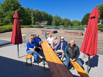 Andreas Gravelius (re. vorne) mit Team (links), Bürgermeister Michael Ruoff (re. zweiter von vorne), Bauamtsleiterin Brit Kuhl-Wengenroth (rechts) und Tim Bremer vom städtischen Bauhof (re. hinten), auf der neuen Terrasse.