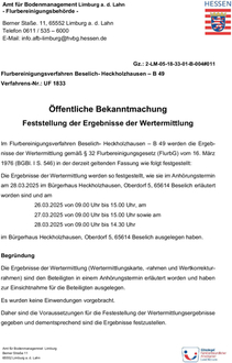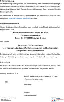 Die Feststellung der Ergebnisse der Wertermittlung wird in der Flurbereinigungsgemeinde Beselich und in den angrenzenden Gemeinden Stadt Weilburg, Stadt Limburg, Gemeinde Waldbrunn, Stadt Runkel, Gemeinde Merenberg, Stadt Hadamar öffentlich bekannt gemacht.