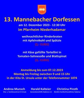 Kita-und Familienzentrum St. Ursula, Generationenhilfe Hadamar e.V. und das Bündnis Familienfreundliches Hadamar laden Bürgerinnen und Bürger aus der gesamten Stadt zum 13. Mannebacher Dorfessen ein.