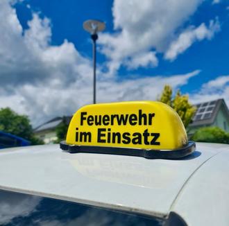 „Feuerwehr im Einsatz“ prangt mit schwarzer Schrift auf gelbem Grund auf dem Dachaufsteller, den der Feuerwehrmann auf der Fahrt zum Gerätehaus auf sein Autodach gestellt hat.