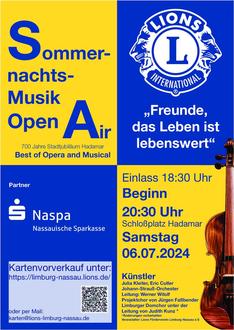 Im Rahmen des Hadamarer Stadtfestes zur 700-Jahr-Feier präsentiert der rührige Club am Samstag, den 06. Juli 2024 die bekannte Opern- und Konzertsängerin Julia Kleiter und ihren Mann, den amerikanischen Tenor Erik Cutler. Gemeinsam mit dem Frankfurter Sinfonie-Orchester unter der Leitung von Witolf Werner gastieren sie beim 3. Open Air Konzert des Lions-Clubs auf dem romantischen Schlossplatz in Hadamar.